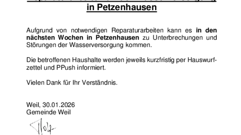 Aufgrund von notwendigen Reparaturarbeiten kann es in den nächsten Wochen in Petzenhausen zu Unterbrechungen und Störungen der Wasserversorgung…