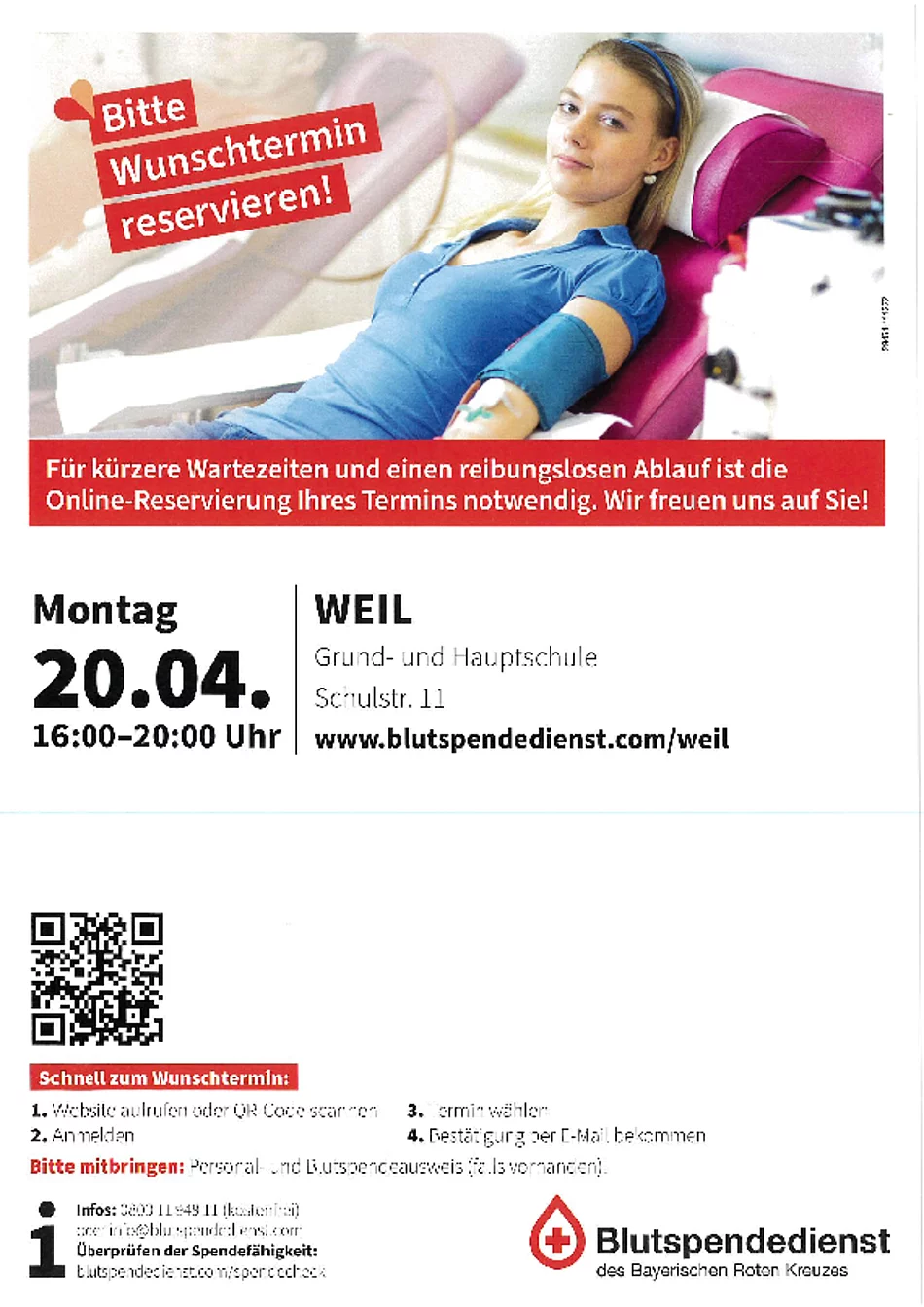 Montag, 20.04.2026, 16:00 - 20:00 Uhr in der Grund- und Mittelschule Weil, Schulstr. 11