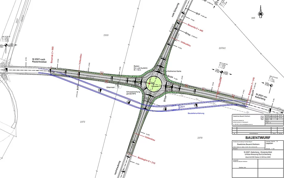 Zur Aufrechterhaltung des Verkehrs auf der Staatsstraße 2027 wird eine asphaltierte Baustraße als Behelfsumfahrung dieses Knotenpunktes eingerichtet. Siehe Planausschnitt mit Behelfsumfahrung.