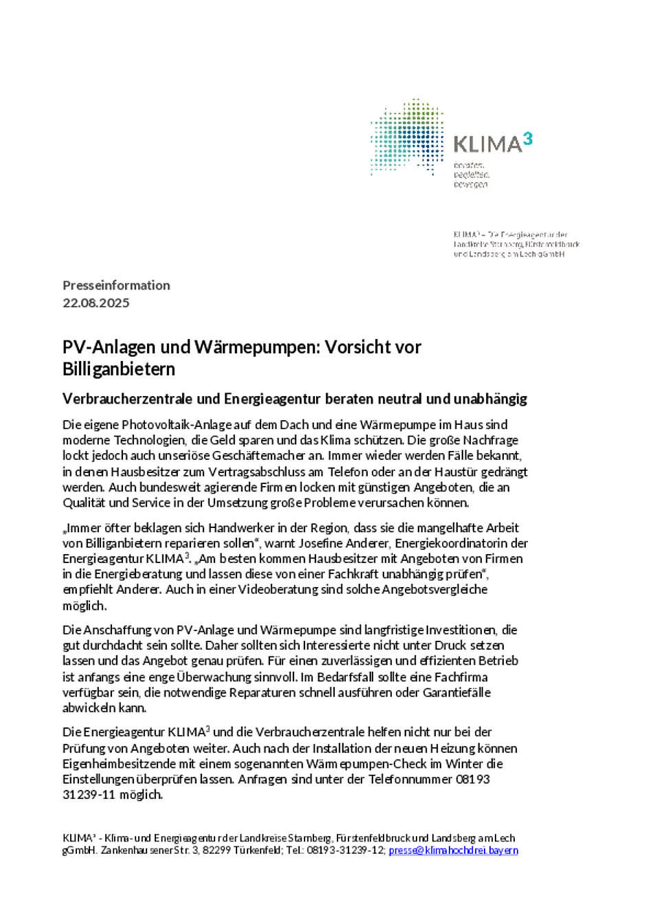 Die Energieagentur KLIMA3 und die Verbraucherzentrale helfen nicht nur bei der Prüfung von Angeboten weiter. Auch nach der Installation der neuen Heizung können Eigenheimbesitzende mit einem sogenannten Wärmepumpen-Check im Winter die Einstellungen überprüfen lassen. Anfragen sind unter der Telefonnummer 08193 31239-11 möglich.